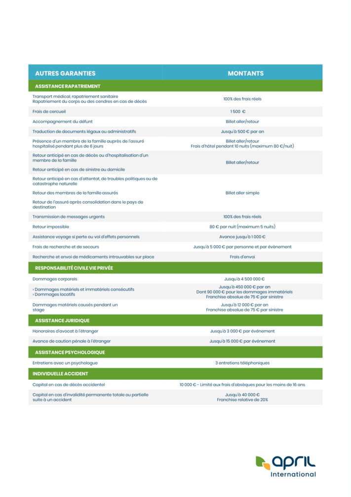 - Assistance rapatriement complète et Responsabilité civile vie privée.